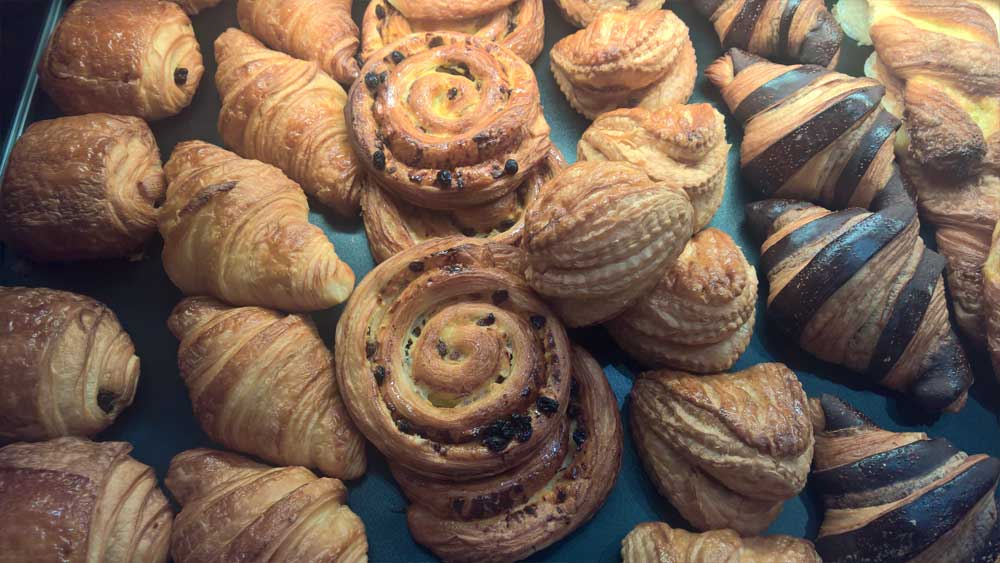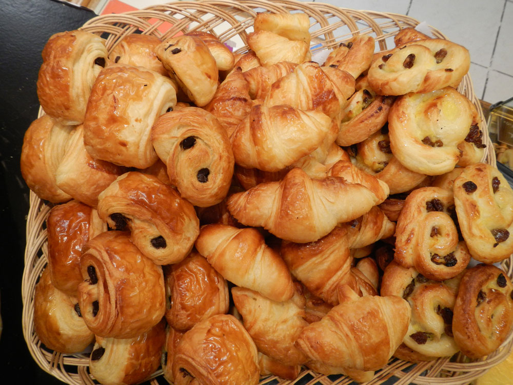 Croissants, chocolatines, pains au raisin, roulé pistache-cramberry, suisses chocolat et chocolat blanc - noisettes torréfiées, mini viennoiseries, croissant bicolores...
